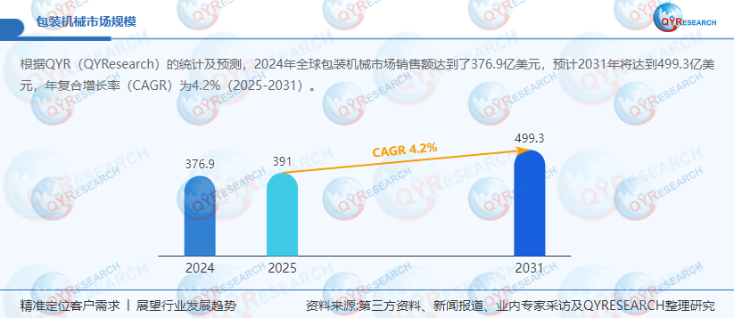 根据QYResearch的统计及预测,2024年全球包装机械市场销售额达到了376.9亿美元,预计2031年将达到499.3亿美元,年复合增长率(CAGR)为4.2%(2025-2031)。地区层面来看,中国市场在过去几年变化较快,2024年市场规模为 百万美元,约占全球的 %,预计2031年将达到 百万美元,届时全球占比将达到 %。